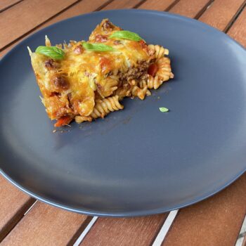 - Auflauf schichten: Heizen wir den Ofen auf 180 °C vor. In einer großen Auflaufform verteilen wir die gekochte Pasta gleichmäßig. Dann gießen wir die Hackfleisch-Tomatensauce darüber und mischen alles gut durch.